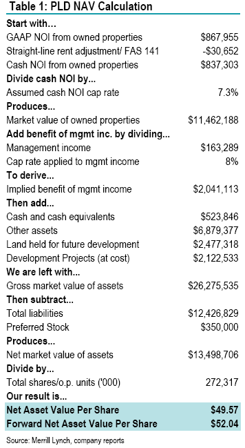 I include below the calculation Merrill Lynch (MER) gives for NAV of (PLD).
