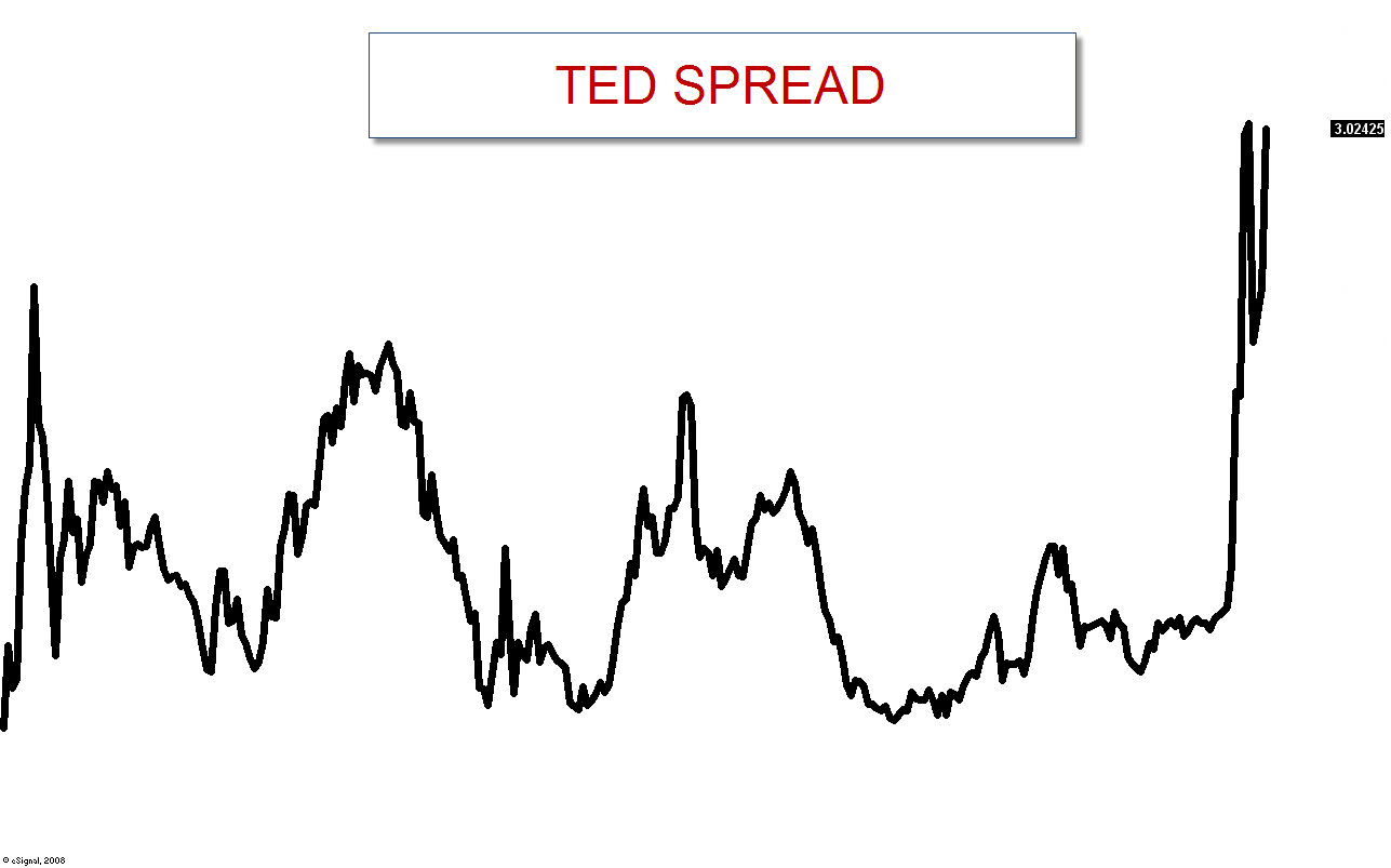 The TED Spread is above 300 basis points. This is not a good sign. View this through the lens of caution. This is no time to try to call a bottom. The bottom will only be known in hindsight. From this traders point of view, the bottom is far far lower. For another view of this, check out The Chairman’s blog.