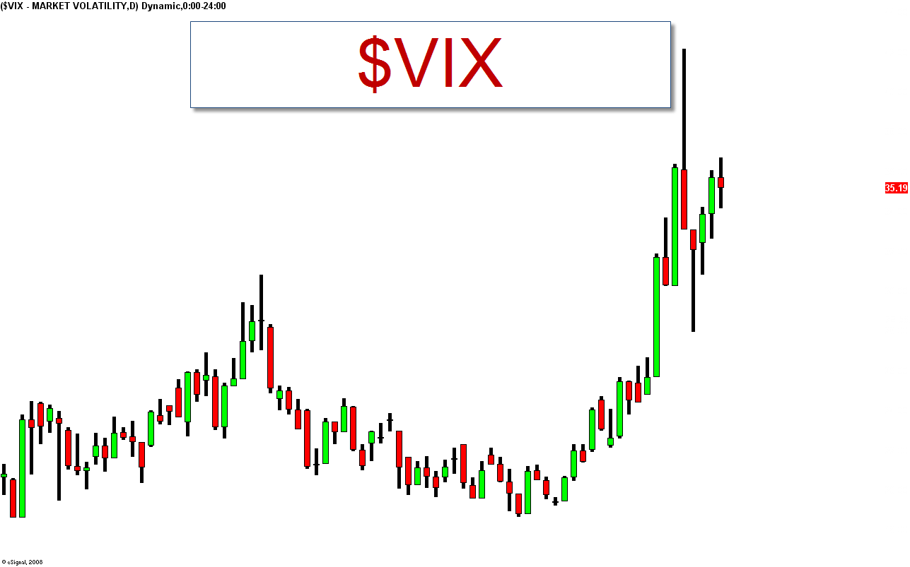 Along with the TED spread, take a look at the $VIX. Typically, when the $VIX hits the mid 30’s to low 40’s, it backs off pretty quickly. It is not behaving as it typically does. It looks to me like it is basing for a move higher. Perhaps higher than any of us have ever seen. Downside insurance remains my play.