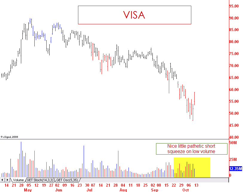 In a conversation with a trader this weekend, he mentioned the IPO price for Visa (V) is $44. It isn’t surprising to see some hope in that name at this level. Unfortunately, the volume was pathetic. I am undeterred at all. Visa has a passport, or a visa, straight to $22. It is just a matter of time.